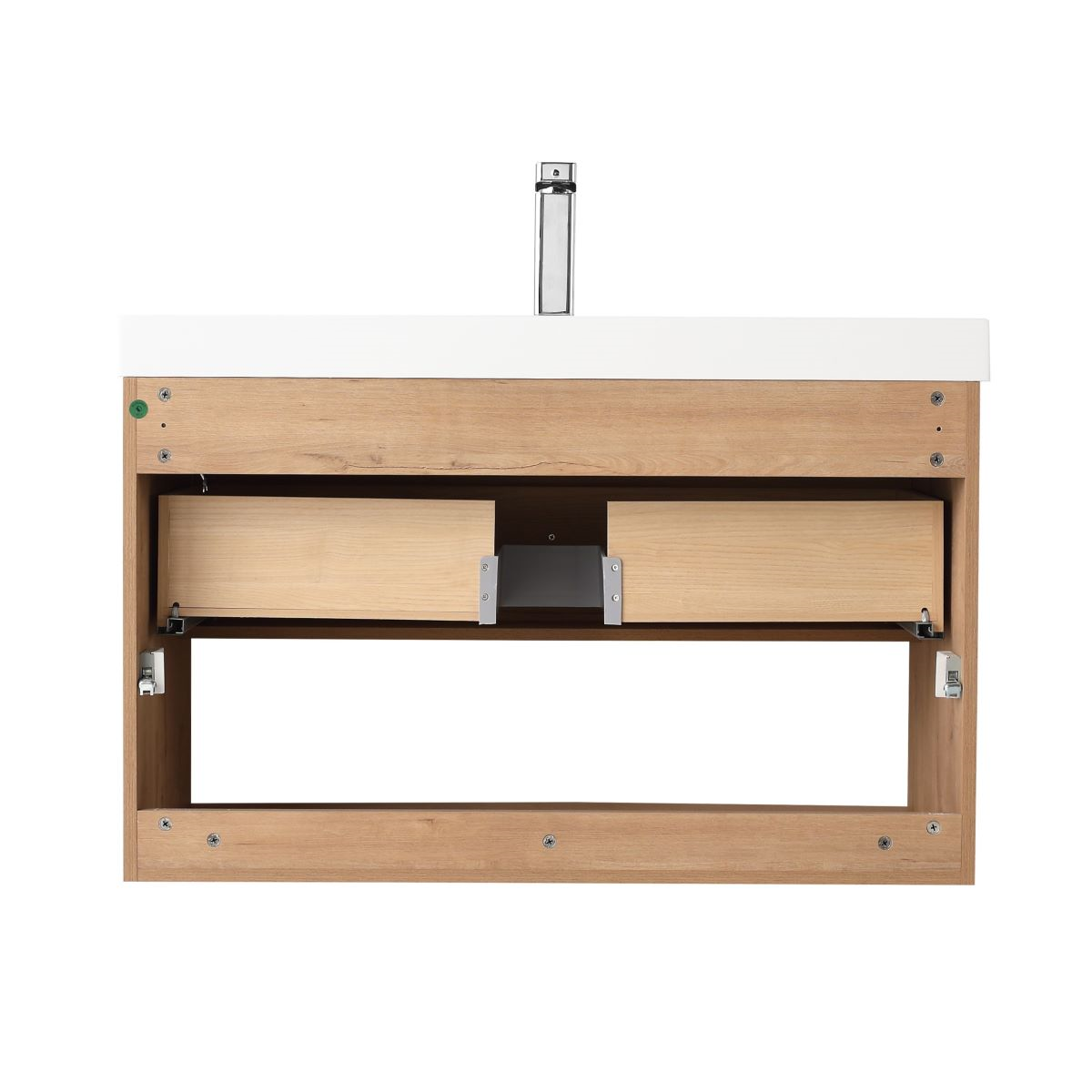 Built from durable, high-grade plywood construction, the vanity ensures long-term reliability. The handle-free design with miter-cut edges adds a sleek, seamless look, while the soft-closing drawer delivers smooth, silent operation. The built-in U-shaped cut-out allows easy plumbing installation without compromising storage space.